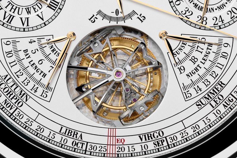 Built by three watchmakers over eight years for a single client, It is undeniably a pretty cool watch. There’s an astronomical calendar, which includes a display of the phases and age of the moon, a hand that tracks the movement through the Zodiac along with the equinoxes and solstices and a rotating sky chart. There are three full calendar systems in this watch. The first is a Gregorian perpetual calendar that includes displays for the date with a retrograde hand, day of the week, month and year in the leap year cycle. There are also indicators for the number of the day of the week and number of the week in the year in accordance with the ISO 8601 standard calendar. There is also a Hebrew perpetual calendar which shows the Hebrew name of the day, Hebrew name of the month, Hebrew date, Hebrew secular calendar, Hebrew year, whether the year has 12 or 13 months, where in the 19-year lunar cycle this year is, and the date of Jewish holy day Yom Kippur, which moves around the calendar. It has a double retrograde split-seconds chronograph and…. it tells the time in both sidereal and solar hours and minutes. Sidereal time tracks the earth in relation to the stars instead of in relation to the sun and differs from solar time by plus or minus a few minutes. Sometimes a few minutes make all the difference. You can also see what time the sun will rise and what time it will set in the watch owner’s home city as well as how long the day and night will each be on that day. The hours and minutes are shown with regulator-style hands, meaning the hours and minutes are on separate axes. The small gold hands show a second earthly time zone.